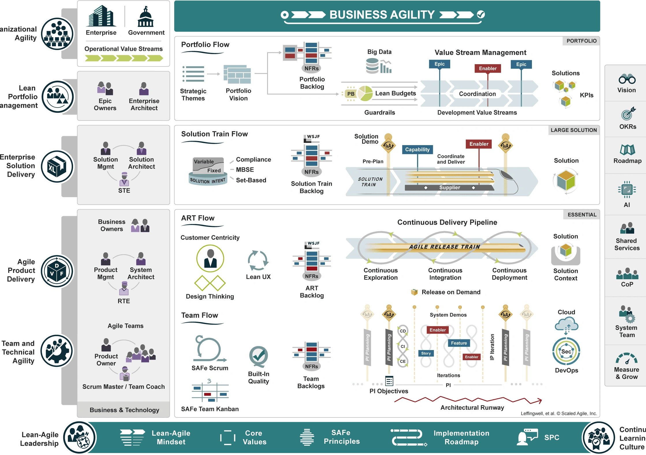 SAFe® (acrónimo de Scaled Agile Framework Enterprise) es un marco de trabajo para el escalamiento de las prácticas ágiles basado en los principios de Lean y Agile para el desarrollo de software y sistemas, a nivel corporación. Más de 200 partners en 50 países distinto. Sobre 450.000 personas certificadas y entrenadas.